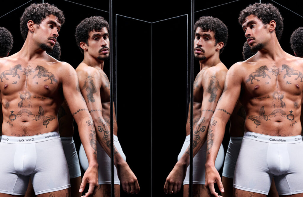 For Spring 2025, Calvin Klein introduces Puerto Rican singer Bad Bunny as the face of their Icon Cotton Stretch underwear. Shot by legendary lensman Mario Sorrenti, the campaign is all about sensuality and star wattage. Set to his hit song EoO, the Grammy Award winner owns the look in both black and white briefs, and tattoos, against a mirrored backdrop.