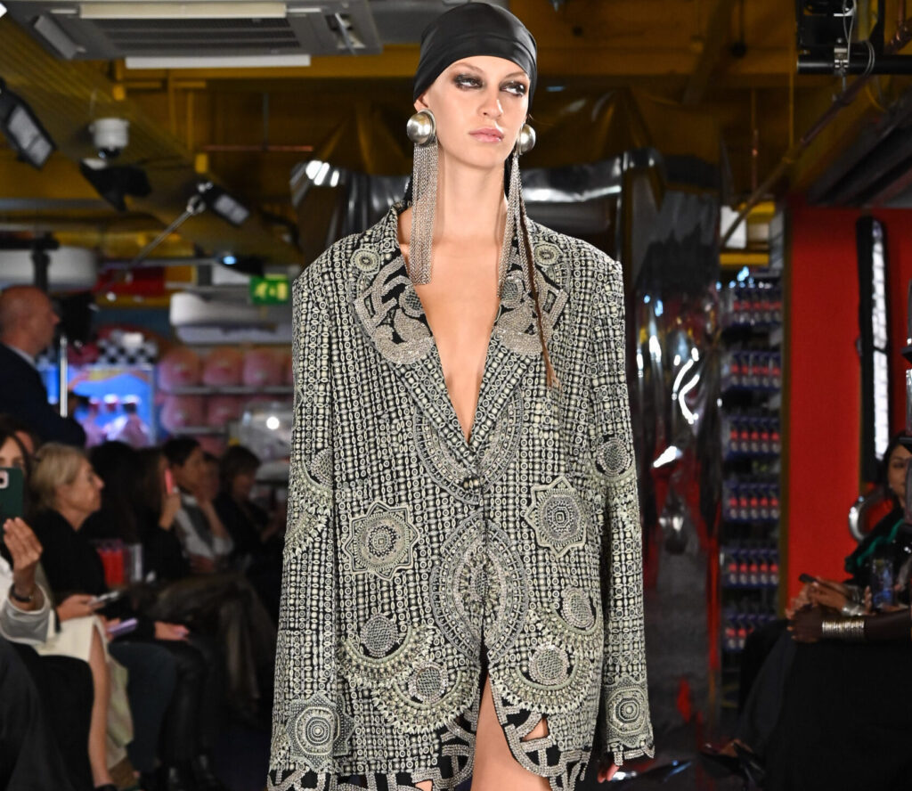 As the most anticipated show of the season, Burberry came to life in a tent at Perks Field in Kensington Place. Daniel Lee’s SS26 collection, inspired by ‘fashion’s love affair with music’, showcased fringed leather and crochet tops that would be ideal at music festivals. Retro influences were evident in the mix of checkered trench coats, embellished eveningwear, and unisex suiting. Per WWD: ‘Musicians have always had incredible style, and together with fashion they form a really strong culture’, said Lee. ‘From festivals and stadiums to open-air concerts, every summer the UK comes to life with style and sound.’