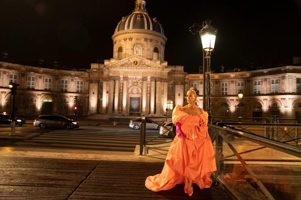 From the voluminous off-the-shoulder sleeves and the bright tangerine colour to the bow detail at the back, there is a lot to love about this Valentino gown, which Carrie wore while spreading Big’s ashes off a bridge in Paris. Accessorised with pink gloves, multiple pairs of earrings, and an elaborate bun, it was the true Carrie way to bid goodbye to the love of her life.