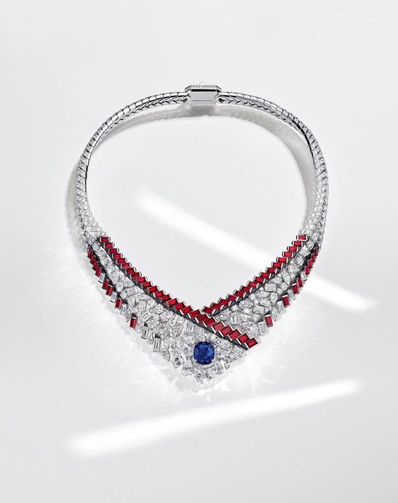 A manifesto of artistic creativity, Chanel high jewellery is the result of the atelier’s master craftsmen’s skills. From sketch to fabrication, the creation studio and the artisans in the workshops at Place Vendôme in Paris bring to life the most precious materials, meticulously sourced to achieve the highest design aesthetic and quality. Gemstones play a central role with bold, brilliant colours. one of the most iconic styles in this collection is the graphic line necklace; handcrafted to enhance the grace of movement, it is set with a 10.15-carat cushion-cut sapphire sourced from an exquisite set of five Kashmiri stones. The chevron motif and gradation of 24.35 carats of baguette-cut rubies in pure, simple lines evoke rhythm and speed. The Chanel fine jewellery creation studio took on the challenge of making the reverse side of the necklace as beautiful as the front, displaying the name of the house on the back of the piece—a first in Chanel high jewellery.