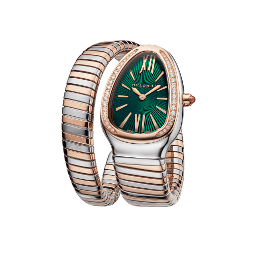 Whether realistic or geometrically abstract, each Serpenti prestige watch is able to wind Bulgari’s hallmarks together: a love of colour, the juxtaposition of materials, innovative artisanal techniques, and a subtle wearability. With Quartz movement, 35mm steel curved case with 18 kt rose gold bezel set with brilliant-cut diamonds, the 18 kt rose gold crown of the Bvlgari Serpentine is set with a cabochon-cut pink rubellite, green lacquered dial with guilloché soleil treatment, and single-spiral 18 kt rose gold and steel bracelet.