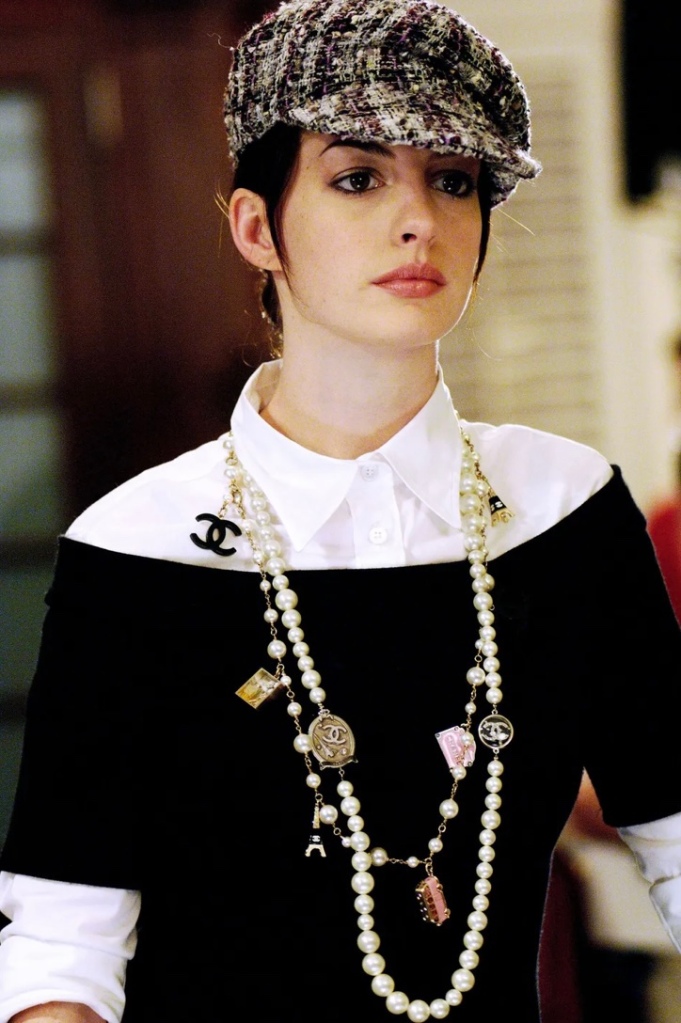 Anne Hathaway’s transformation is cinema’s most referenced makeover arcs even today. Her minidress, blazer, sheer tights, knee-high boots and Chanel multi-layer necklace is a look that ‘a million girls’ would die for. Her white shirt fastened up to the top button, off-the-shoulder dark jumper, layered necklace and baker boy hat is another iconic style. Miranda Priestly’s extravagant coats are a must-have old-money look for Fall.
